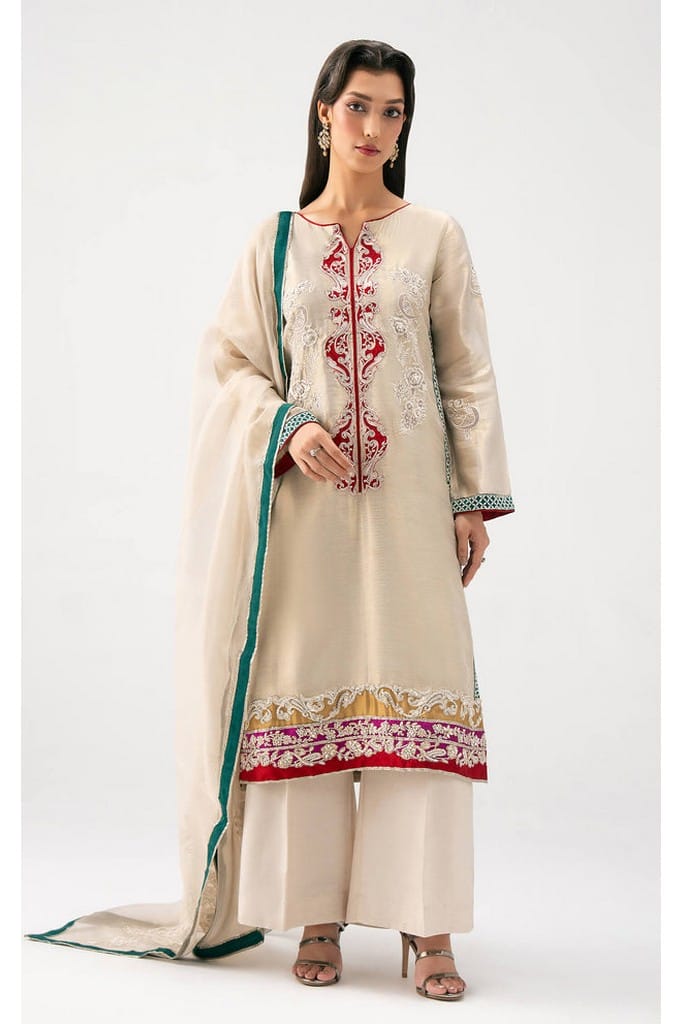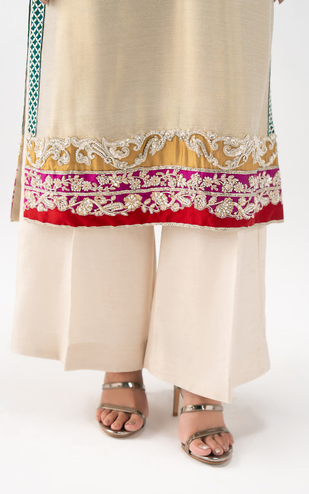 Imbued with ethereal charm, this light grey semi-formal look is tailored from delicate Net Zari, exuding quiet luxury. The shirt is embellished with elegant embroidery and refined applique work, enhanced with adda detailing for a rich texture. Paired with graceful palazzo pants and a pure organza zari dupatta, this look blends tradition and modernity in perfect harmony.