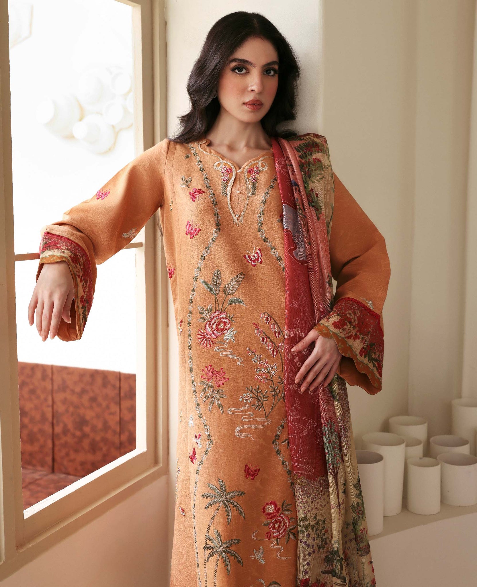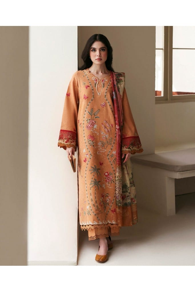 A long-length, 3-paneled shirt crafted from luxurious self-jacquard fabric, adorned with Parsigara embroidery on the side panels in vibrant hints of red, coral, and green, bringing depth and artistic flair to the design. The printed sleeve border adds a subtle touch of sophistication, while the printed slub monar dupatta features sectional color blocking for a modern yet graceful aesthetic. Finished with delicate lace detailing that enhances its feminine charm and paired with a cambric trouser, Orlane beautifully balances traditional craftsmanship with contemporary elegance.