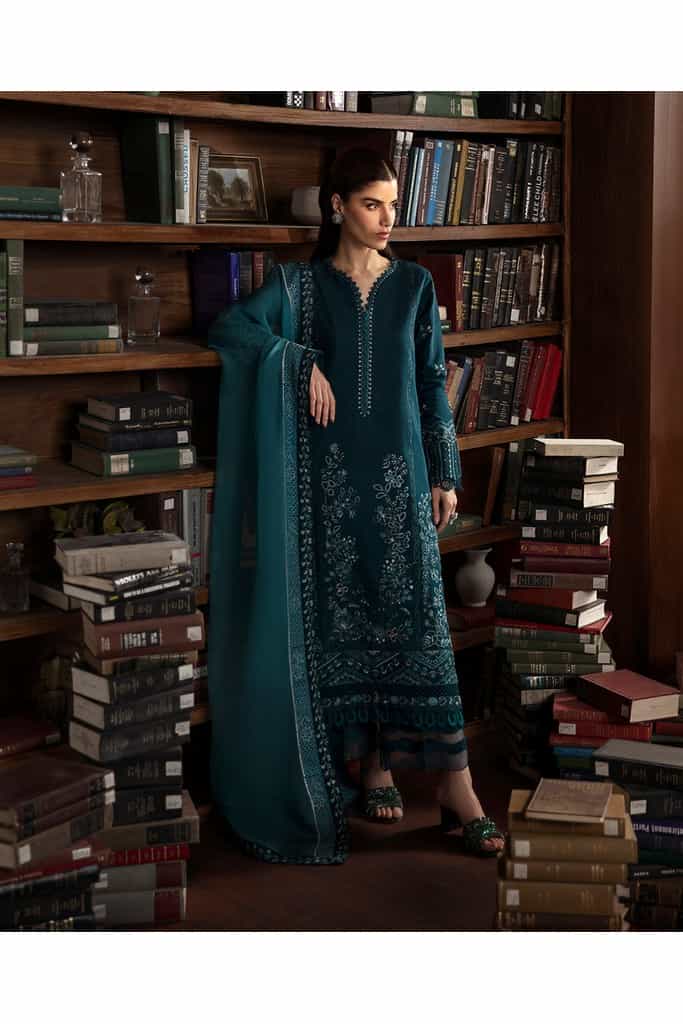 Draped in a breathtaking blend of teal and blue, this ensemble features a seamless fusion of tonal and contrasting embroideries, meticulously woven into the fabric. The delicate floral motifs embellish the overall outfit, adding a touch of refined femininity. Complemented by straight culottes with a multi layered laser-cut and an exquisitely embroidered contrast organza dupatta, this outfit exudes timeless elegance.