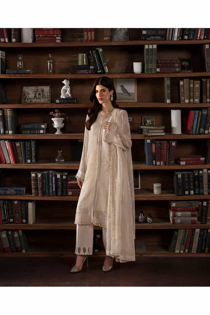 “Fée” Luxuriously rendered in a soft, creamy white, this ensemble is a masterpiece of tone-on-tone embroidery, with delicate thread work that whispers elegance. The scalloped neckline and intricate floral motifs add a refined, feminine grace, elevating the entire silhouette. Paired with a delicate laser-cut straight culottes and an embroidered chiffon dupatta, this ensemble is the epitome of timeless, understated opulence.