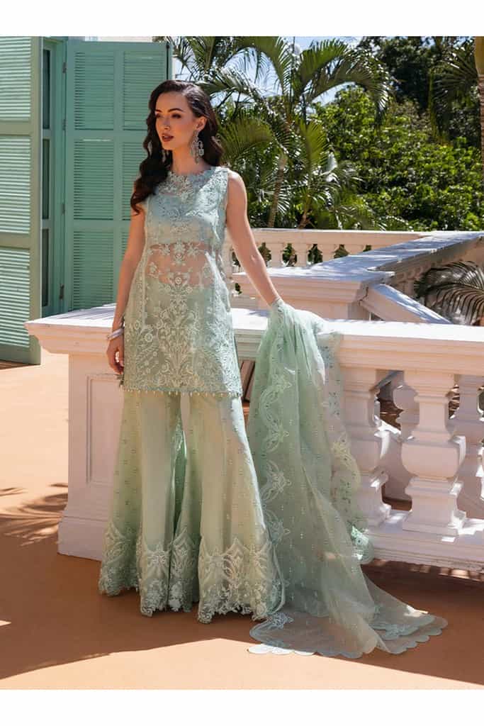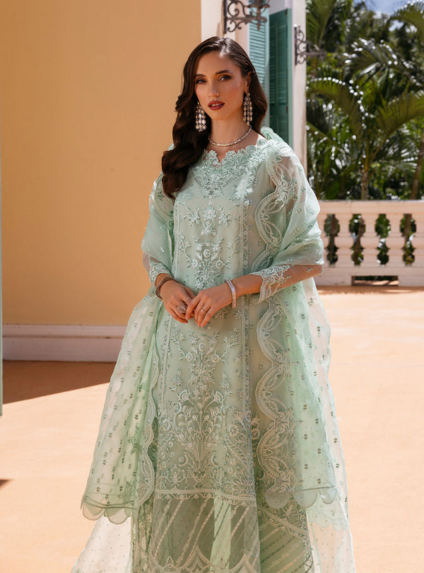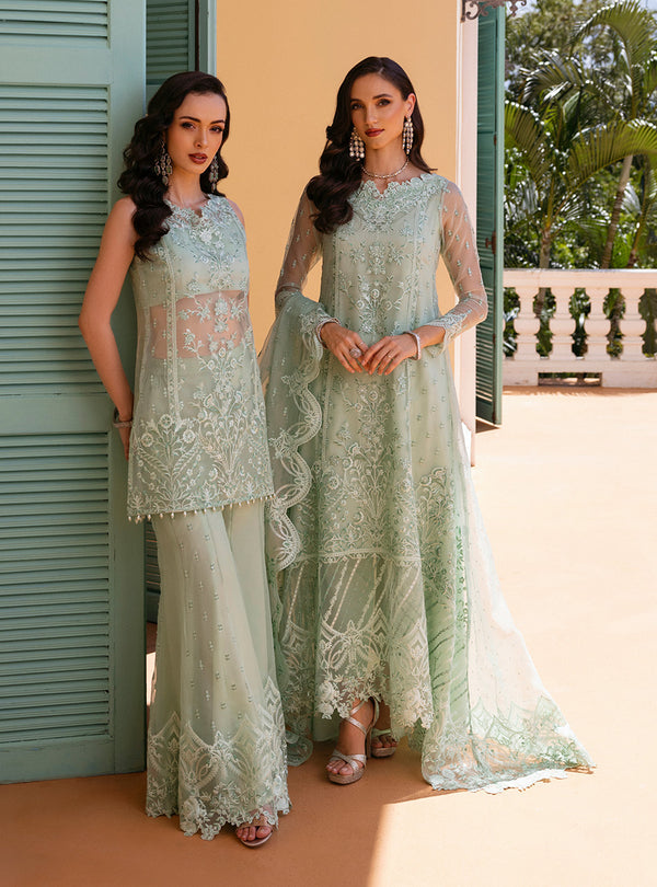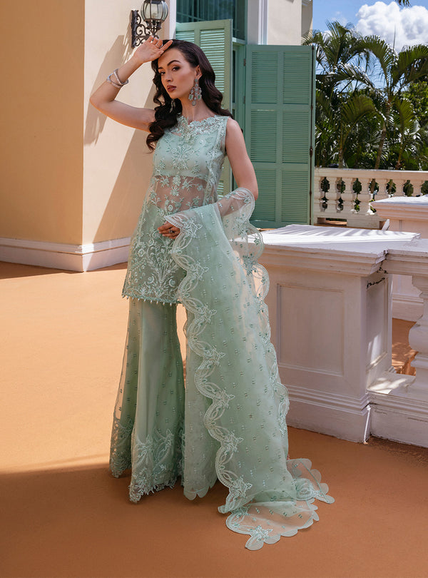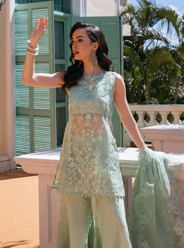 This mint green wedding festive ensemble exudes refined elegance. The exquisitely embroidered shirt features a captivating blend of soft sequins that shimmer in the light, adding a subtle sparkle to the overall look. The ethereal neckline is meticulously detailed with delicate threadwork in light gold and mint green, creating a harmonious balance of colors and textures. This stunning outfit is a perfect choice for a wedding celebration, offering both grace and glamour.