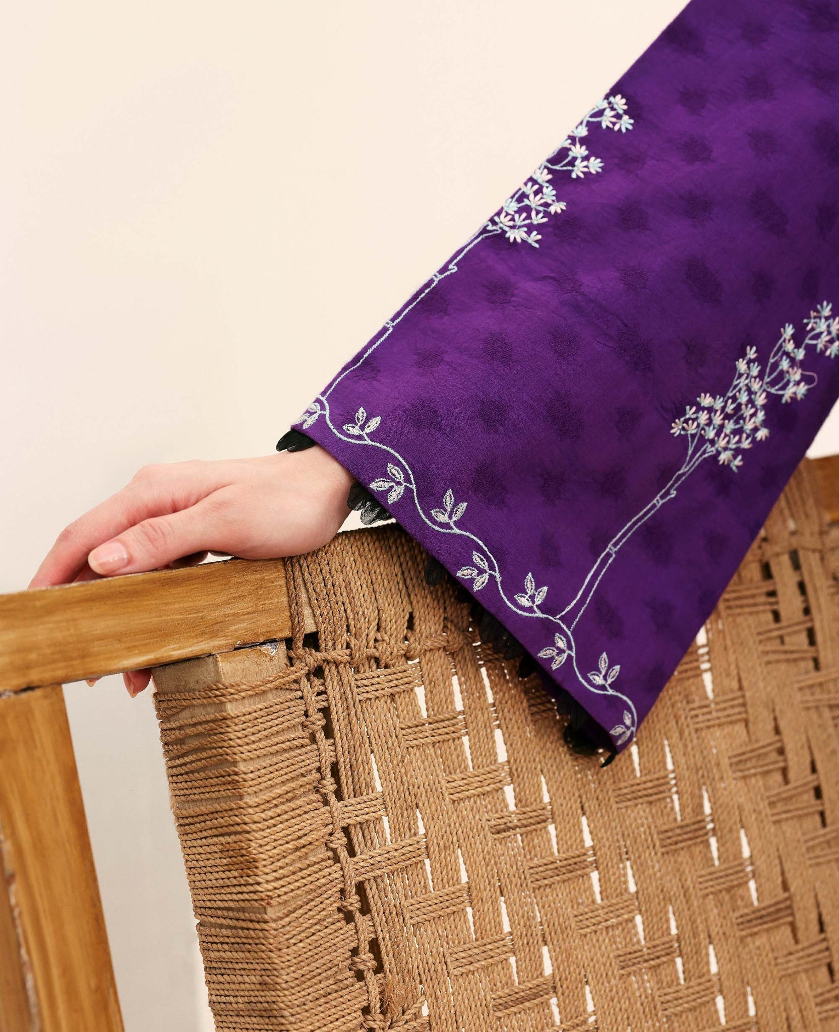 A regal purple ensemble that radiates sophistication. The long-length shirt is adorned with Parsigara embroidery in delicate hints of red, pink, white, and blue, creating a harmonious blend of color and texture. Paired with a Chandheri net dupatta featuring a hint of black and 4-sided embroidered borders, and complemented by a cambric trouser with fine stitching details, Violette beautifully merges tradition with contemporary elegance.