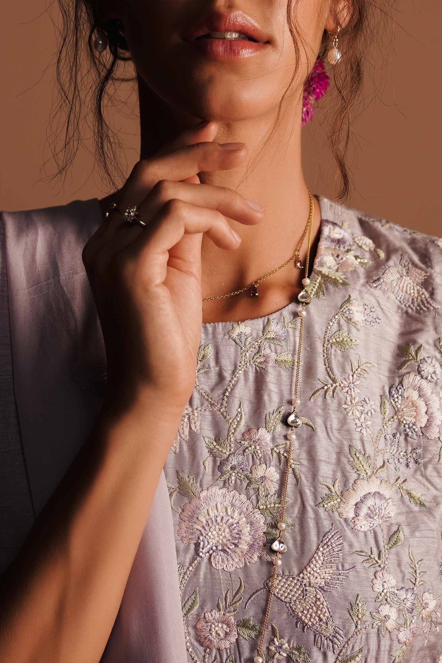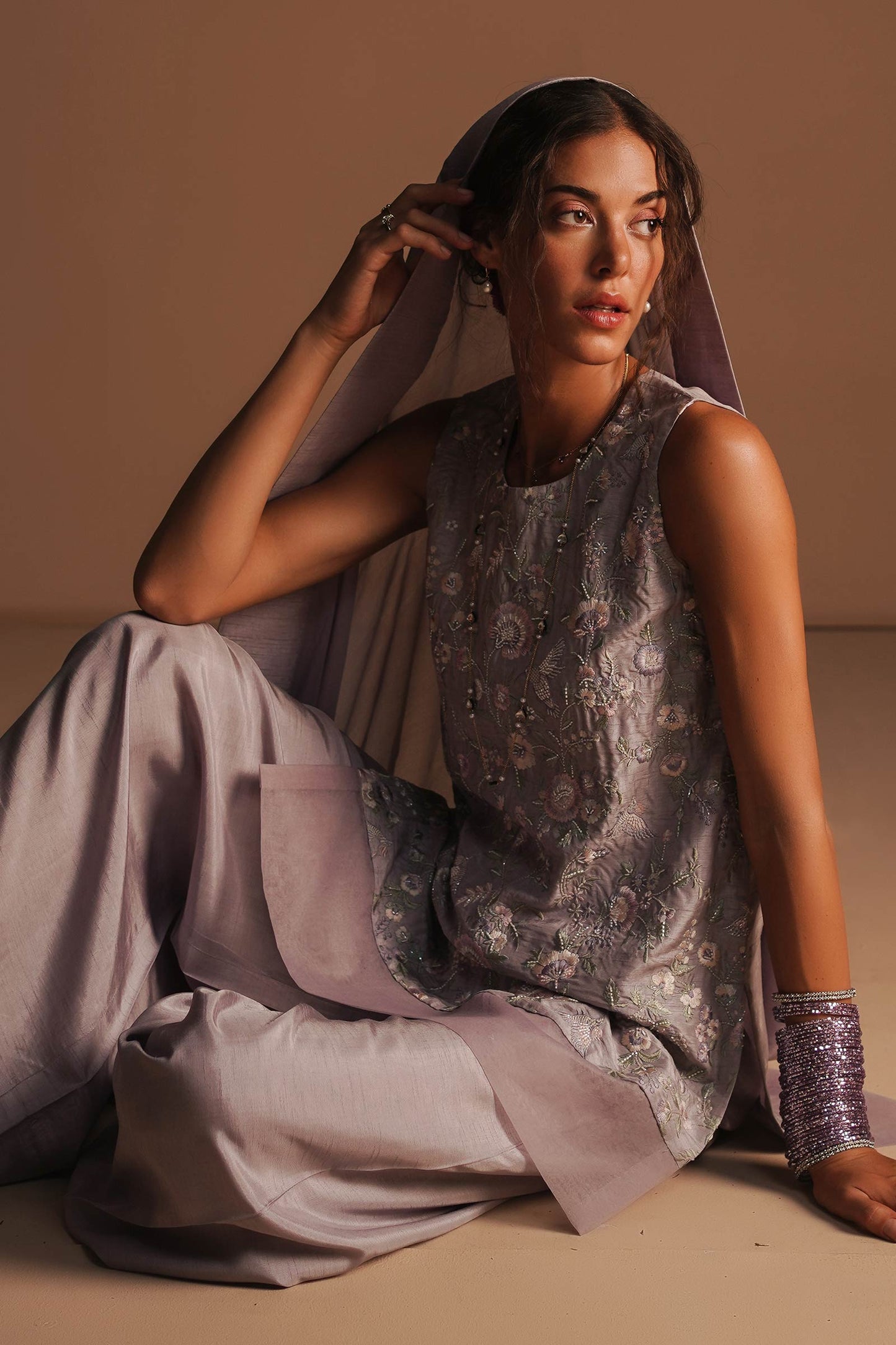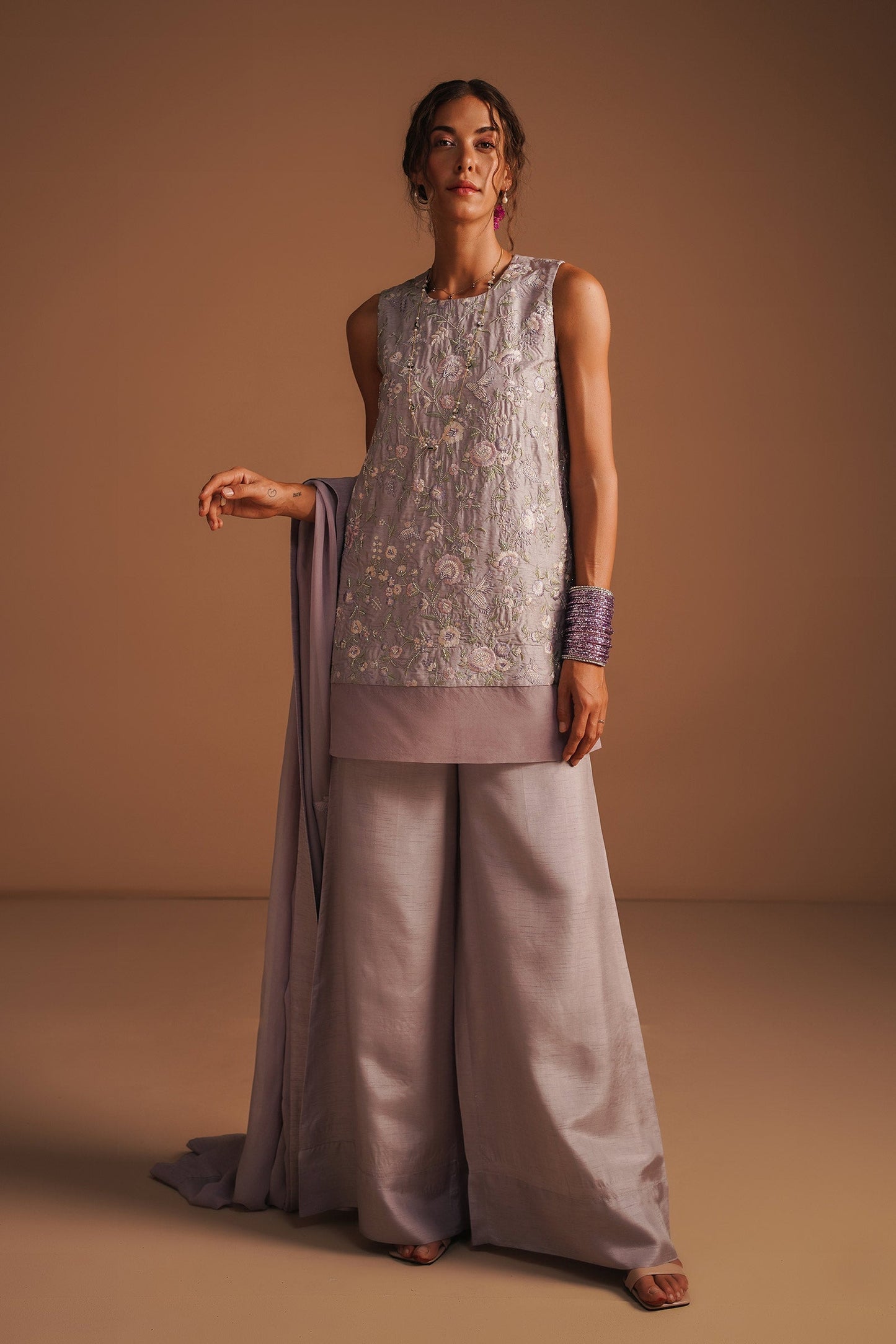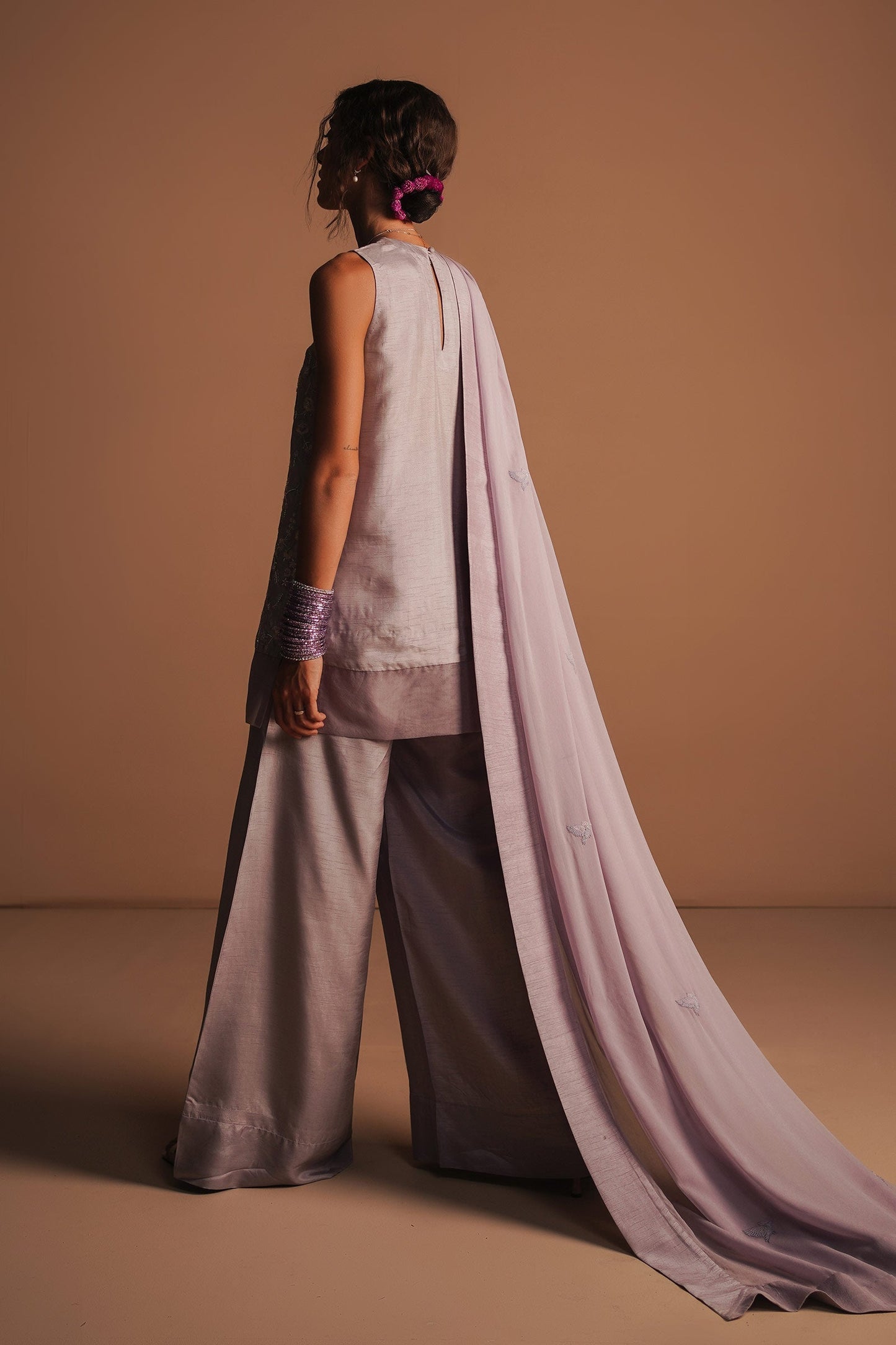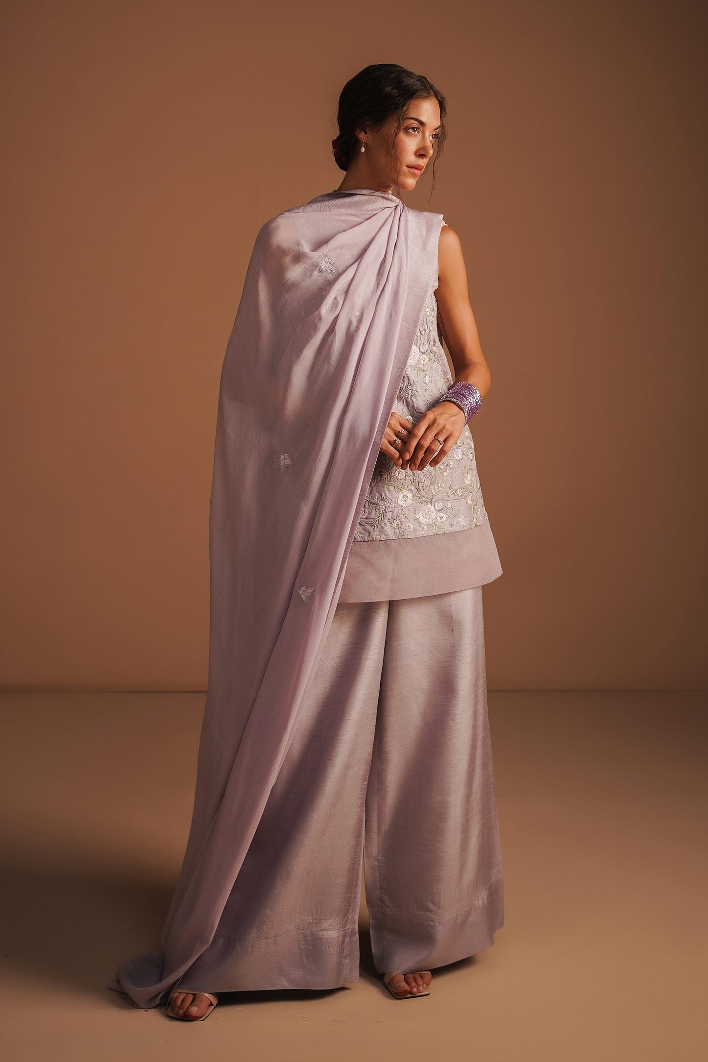 Lilac short shirt with gara embroidery, elevated with adda work. It is paired with a farshi trouser and a light embroidered dupatta.